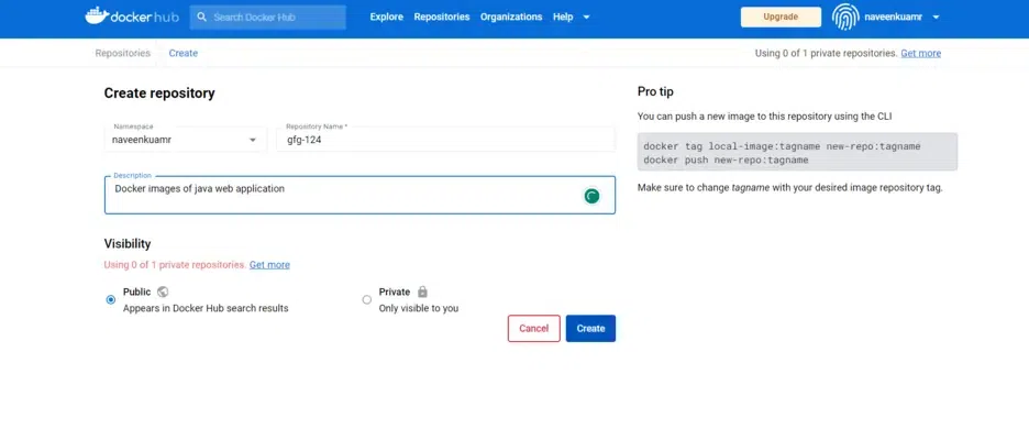 步骤 3:最终,借助Docker 命令创建存储库后,我们可以推送或拉取镜像。以下命令用于将本地存在的 docker 镜像推送到 Dockerhub。