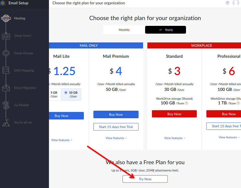 - 打开的页面会先显示收费的选项,把网页往下拖,然后就看到 “We also have a free plan for you” 的免费选项,点击“Try now”。我们也看到了免费版本是有限制的,比如最多注册 5 个用户, 每个用户 5GB 空间, 附件大小限制为 25M 等。