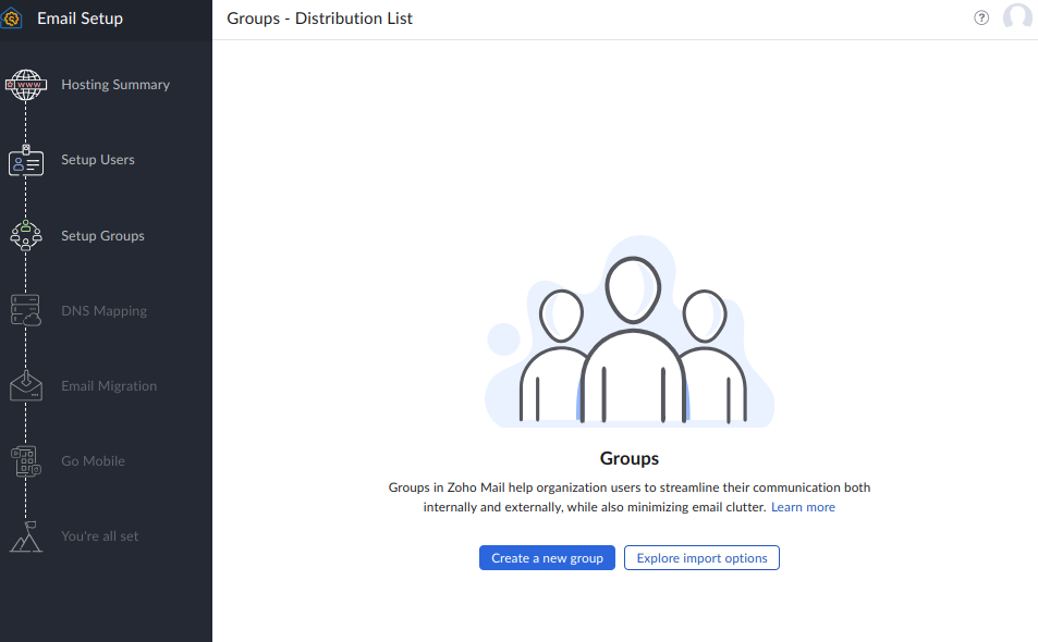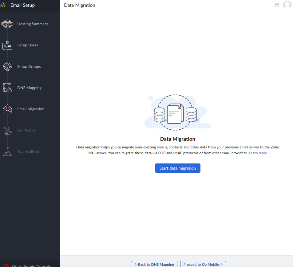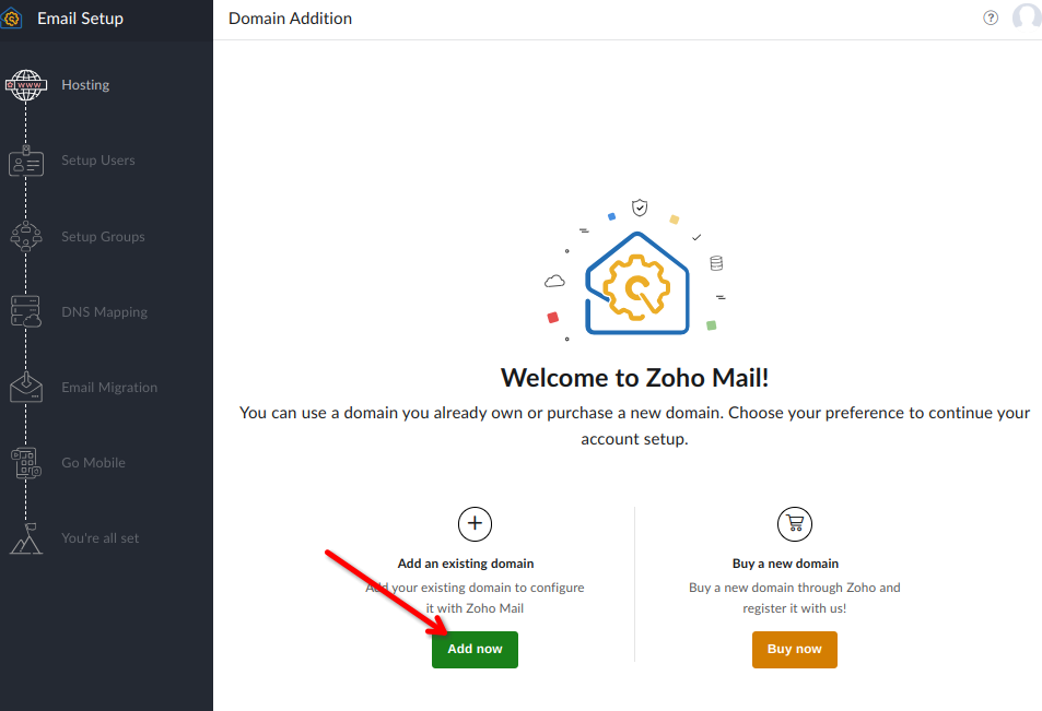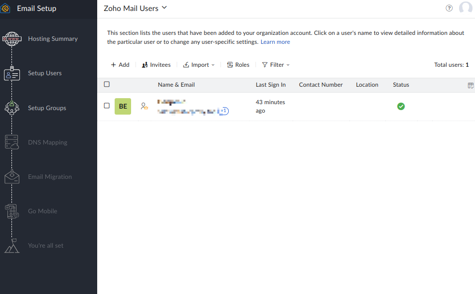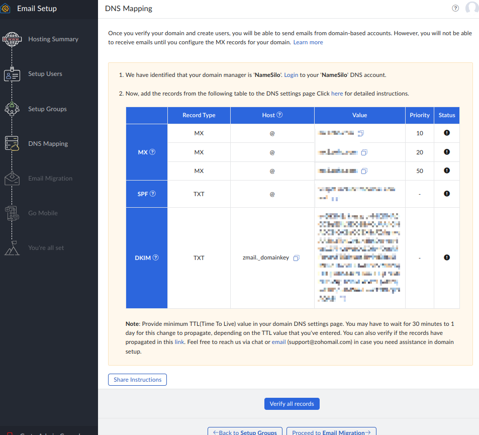 验证过程中尽量不要关闭设置向导界面,一旦关闭再次登陆就进入不了设置向导界面了。如果不小心关闭了设置向导界面,后续可以登陆zoho 企业邮箱管理界面,并导航到 Domains 选择您的域名,对域名下的 MX, SPF,DKIM 记录逐一验证。